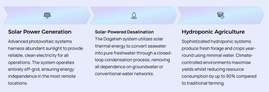 The Dogaheh System integrates these three pillars to create a fully autonomous ecosystem that produces clean energy, freshwater, and sustainable food 4 using only sunlight, seawater, and air. No external inputs are required, making it the world’s first truly self-sufficient agricultural system designed specifically for harsh, arid environments.